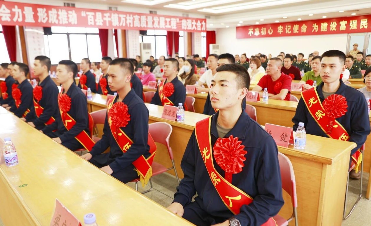 歡送會現(xiàn)場,新兵戰(zhàn)士們身披戎裝,胸戴紅花,精神抖擻。