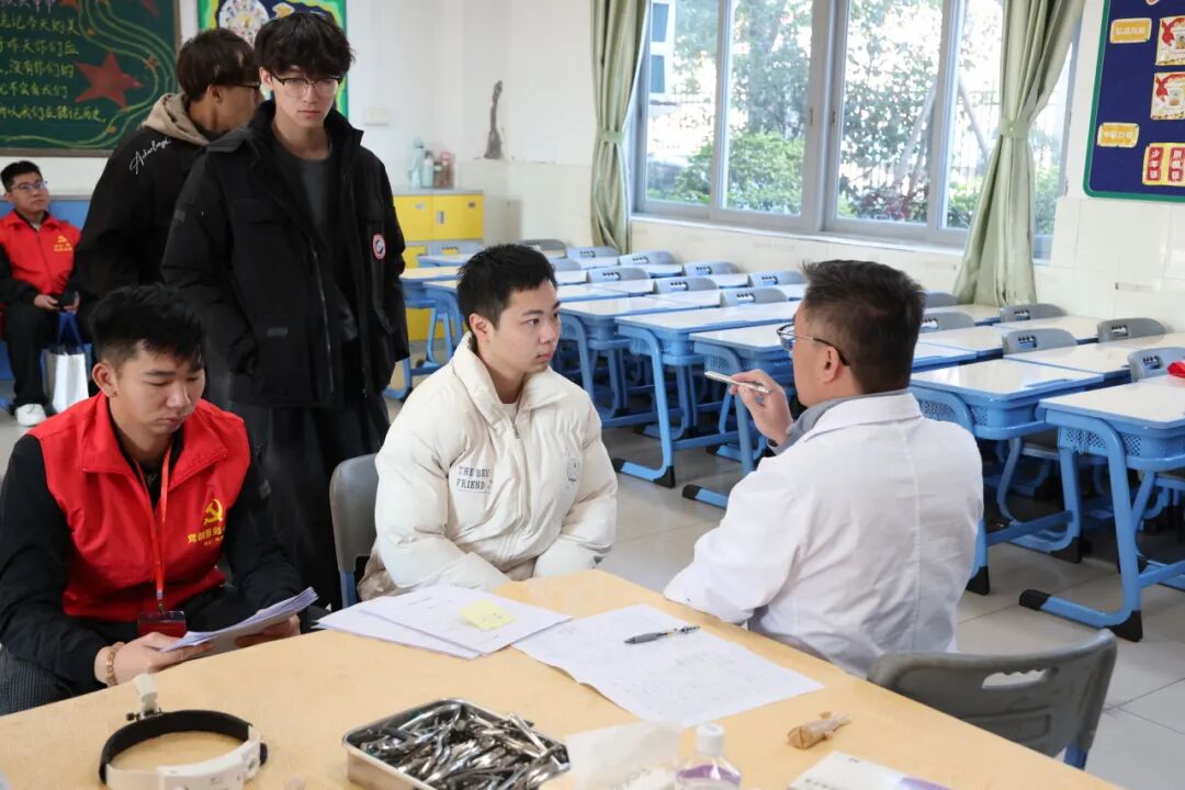 體檢現(xiàn)場,應征青年在街道體檢保障人員的引導下,依次排隊進入內科、外科、五官科、眼科、口腔科等檢查區(qū)域,秩序井然。南朗醫(yī)院醫(yī)務人員嚴格按照《應征公民體格檢查標準》(2022年版)和體檢流程,認真核對身份信息,逐項檢查身高、體重、血壓、視力、聽力等項目,確保不漏檢、不誤檢,嚴把兵員質量第一關。