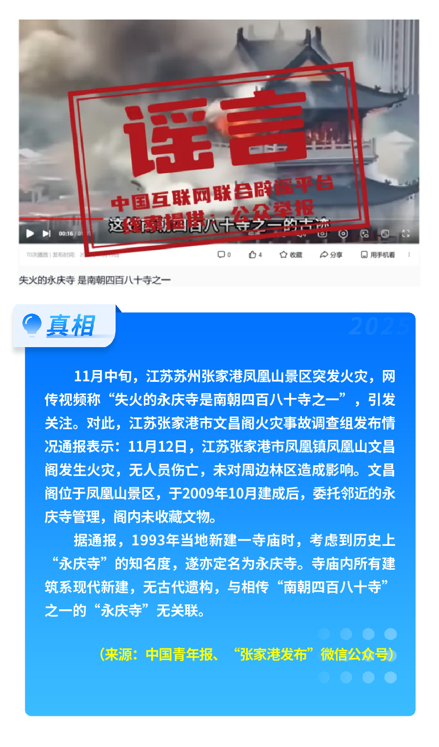 社會熱點(diǎn)事件被歪曲蹭炒。首屆“蘇超”聯(lián)賽泰州隊(duì)奪冠后,“冠軍獲五十萬獎(jiǎng)金、城市地圖放大字號”等謠言流傳,以夸張信息博眼球、引流量;江蘇張家港鳳凰山景區(qū)火災(zāi)后,“‘南朝四百八十寺之一’被燒”的謠言引發(fā)熱議,通報(bào)顯示失火建筑為2009年新建,與歷史上的南朝寺廟無關(guān)聯(lián)。